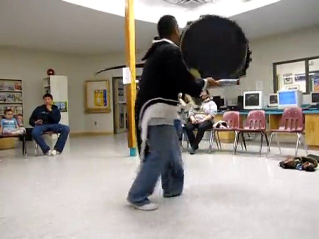 Two members of a professional drum dancing team do a demonstration for Ontario and Kug students.