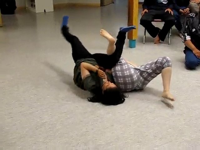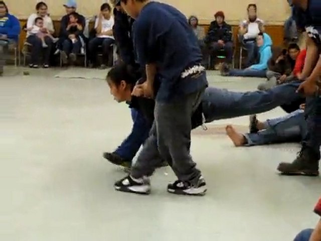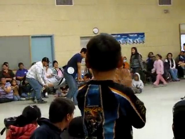 Two women compete: leg wrestling! During Nunavut Day, in Kugluktuk.