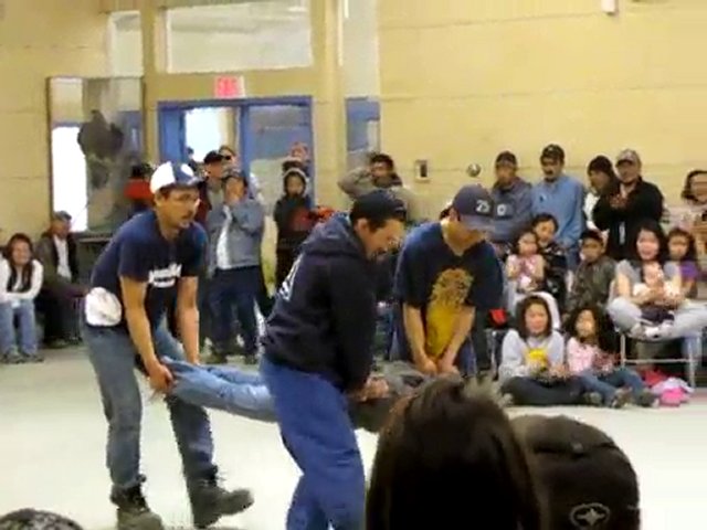 A competitor makes a good go at the "airplane game" during Nunavut Day celebrations in Kugluktuk